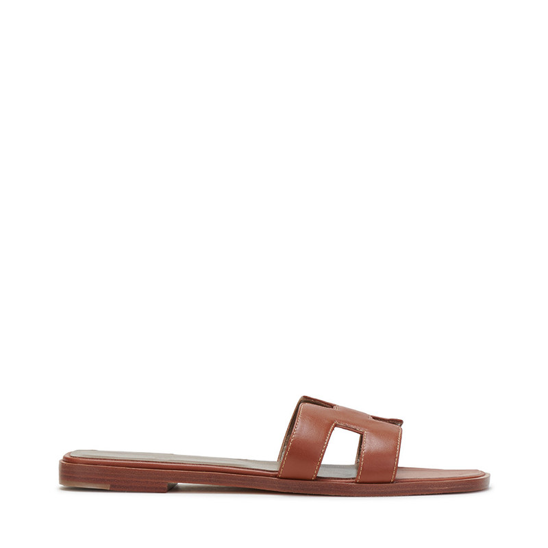 Moda de Verão Couro de Vaca Marrom Sandalias Flat Feminino Com H Cave Superior